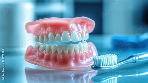 A close-up of a set of dentures sitting on a clean surface next to a toothbrush, emphasizing dental care for seniors.
