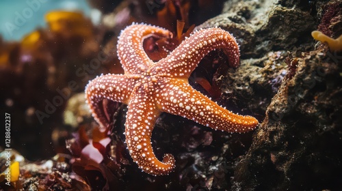 A close-up of a starfish clinging to the rocks at the ocean's floor, with the clear water revealing the intricate details of its limbs.