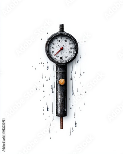 A close-up of a vintage pressure gauge with water droplets, showcasing precision and industrial design. Ideal for technical themes.