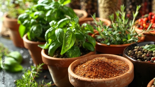 A close-up of fresh herbs and spices in a kitchen, symbolizing healthy and flavorful cooking. High quality images