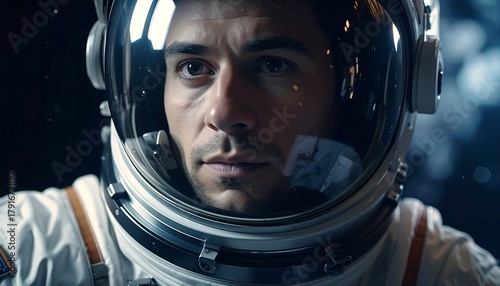 A close-up portrait of a male astronaut. He has a serious expression, and his face is visible through his helmet. The lighting is dramatic