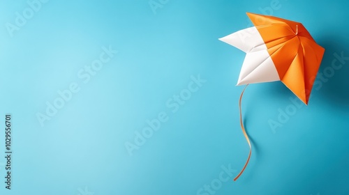 A close-up shot depicting a geometrically folded kite in bright orange and white, set elegantly against a calm blue background, suggesting simplicity and design.