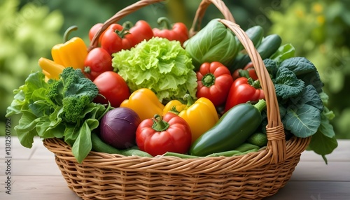 A close-up shot features a woven basket brimming with a variety of fresh vegetables, set against a blurred green background
