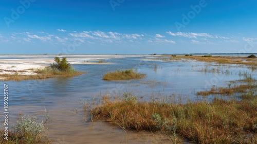 A coastal plain is covered with shallow saline water under clear sunny skies.
