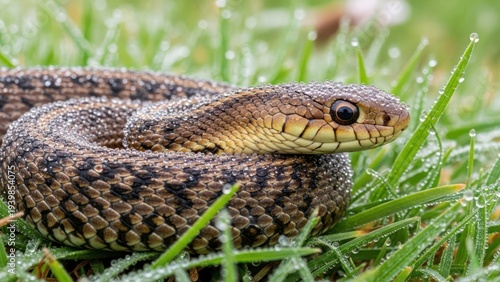 A coiled snake rests in dewy grass, showcasing detailed scales and a watchful gaze