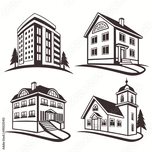 A collection of diverse architectural buildings showcasing different styles and structures. Vector