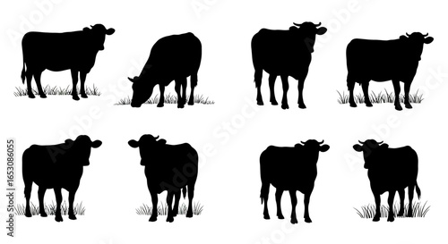 A Collection of Eight Silhouette Images Showcasing Different Cow Poses and Grazing Behaviors in a Field on a White Background Capturing Agricultural Livestock in Various Stances