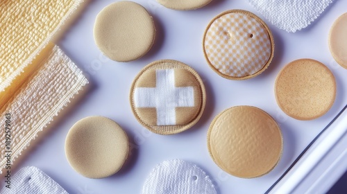 A collection of round beige medical bandages and first aid supplies with white cross designs arranged for a top view flat lay