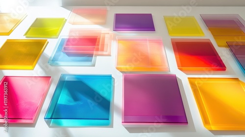 A collection of translucent polymer samples, arranged under bright laboratory lights, showcasing their reflective surfaces and vibrant color gradients in extreme detail.