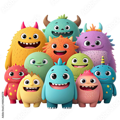 A colorful group of cute and friendly cartoon monsters with big eyes and happy smiles isolated on transparent background