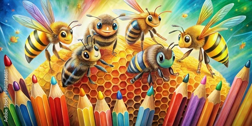 A colorful illustration of busy bees gathered around a honeycomb, surrounded by pencils, crayons, and paintbrushes,
