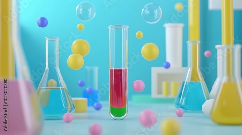A colorful laboratory scene featuring test tubes and spheres, illustrating scientific experimentation.