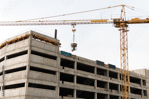 A construction tower crane lifts a concrete mixer to the roof of a building under construction. Crane work at a construction site.
