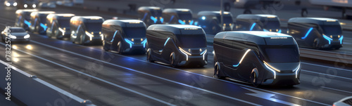 A convoy of autonomous electric trucks with blue accent lighting travels on a highway at dusk, showcasing advanced transportation technology