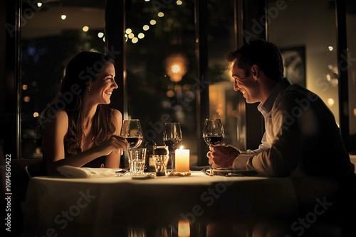 A couple enjoys a romantic first date at an elegant restaurant, laughing over candlelight and clinking wine glasses, their eyes reflecting admiration.