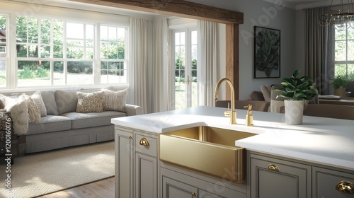 A cozy kitchen with white quartz countertops, a gold farmhouse sink, and rustic pine beams