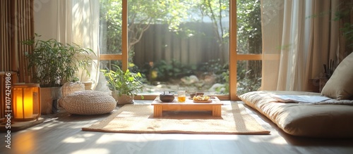 A cozy living room with a large window overlooking a lush green garden.
