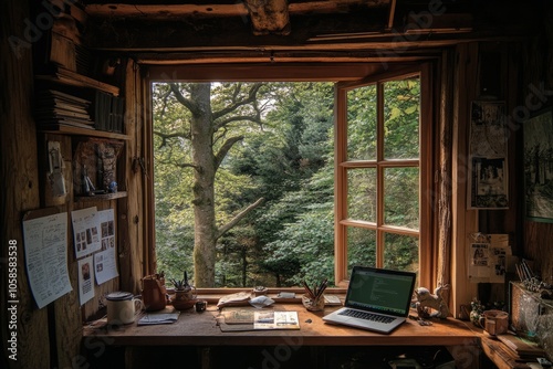 A cozy workspace with a wooden design. The large window offers a view of lush green trees. Perfect for relaxation and creativity. Generative AI