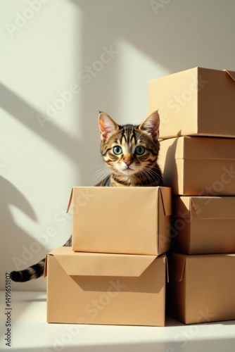 A curious kitten peeks from a stack of cardboard boxes bathed in sunlight, a charming image evoking feelings of warmth and anticipation.