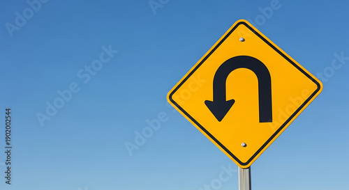 A curved arrow sign indicates a sharp turn ahead on a clear day against a blue sky viewed from a straight road