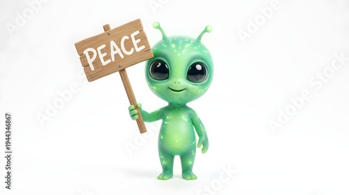 A cute green alien character with big eyes holding a wooden sign that says "PEACE" on a white background, symbolizing harmony.