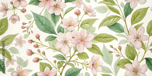 A delicate and vibrant floral pattern featuring blossoming pink flowers and lush green leaves, arranged in a harmonious and repeating pattern.