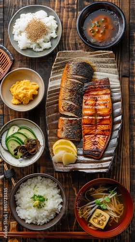A delicious and healthy Japanese meal of grilled salmon, rice, miso soup, and assorted pickles.