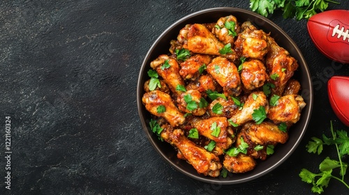 A delicious bowl of spicy chicken wings garnished with herbs, next to two footballs, perfect for game day snacking.