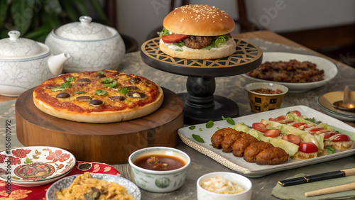 A delicious spread of comfort food featuring a mini burger pizza and savory sides perfect for a casual gathering or meal