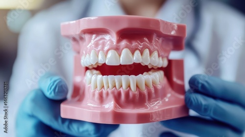 A dental professional is holding a model of human teeth