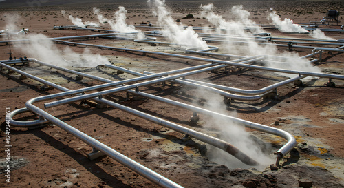 A desert‑based geothermal energy facility featuring intricate pipeline networks and vibrant vents