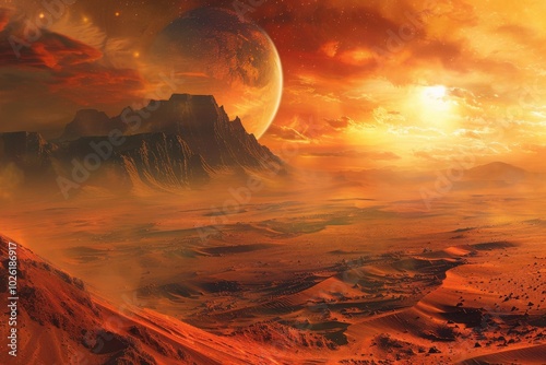 A desolate desert landscape with a large planet in the sky, generative ai image