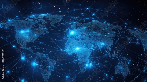 A digital depiction of the world illuminated by blue connections, representing global communication and technology.