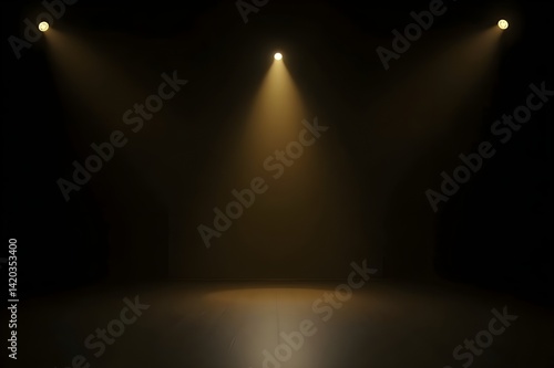 A dimly lit room featuring three bright spotlight beams illuminating the space