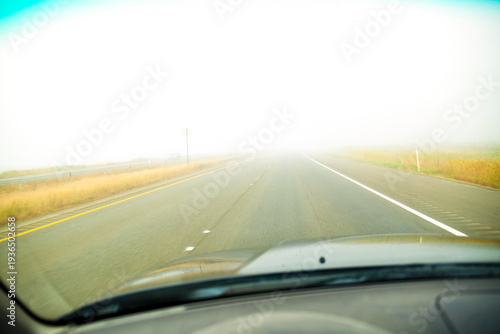 A driver's view of the road ahead with thick fog across the road, limited visibility,.
