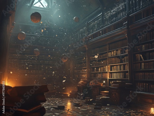 A Dusty, Sunlit Library with Stacks of Books and Floating Orbs