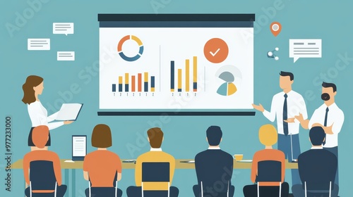 A dynamic business meeting featuring a team presenting data visuals on a screen to engaged colleagues in a conference room.