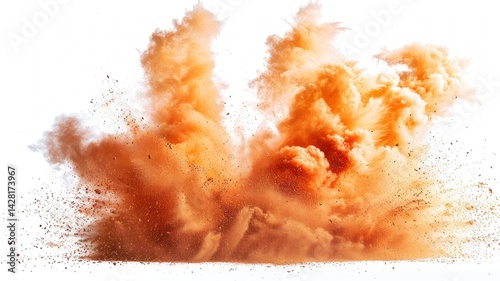 A dynamic explosion of orange dust clouds and debris.