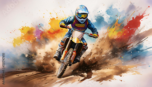 A dynamic illustration of a motocross rider in action, with vibrant splashes of color and motion