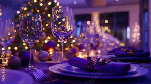 A elegant Family Christmas dinner featuring purple matte decorations and glowing lights, creating a festive atmosphere.