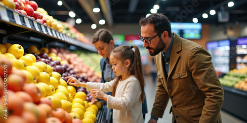 A family of three, including a woman, man, and young girl, is exploring a grocery store's produce section, selecting fresh, colorful apples together with smiles
