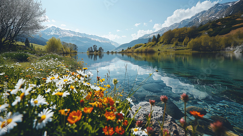 A featuring a crystal-clear lake surrounded by vibrant wildflowers.. Generative ai.