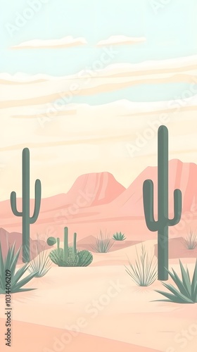 A flat vector illustration of the desert landscape with cacti and mountains at sunset, pink sky