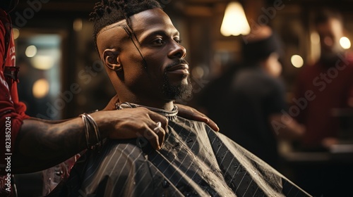 A focused barber with a blurred face giving a trendy haircut to a client in a modern barber shop setting