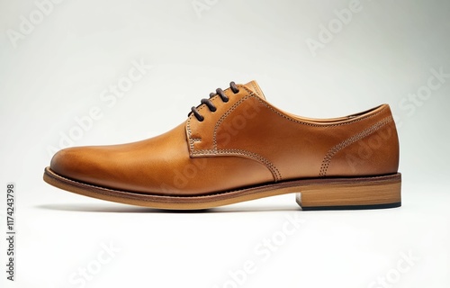 A formal brown leather brogue shoe with elegant perforations, displayed side on over a clean white surface to emphasize its classic appeal, isolated on clear white background.