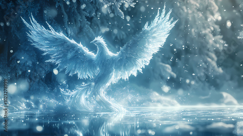 A frozen phoenix, its wings outstretched, its feathers shimmering with ice crystals, rising from a frozen lake, creating a symbol of rebirth and resilience. Frost Phoenix. Illustration