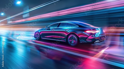 A futuristic electric car speeding on a city road at night, illuminated by vibrant neon lights, showcasing modern automotive design and technology.