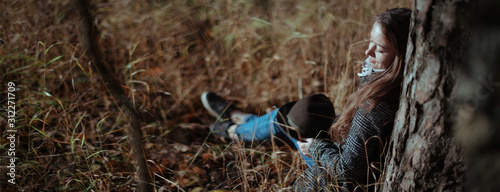A girl sits alone under a tree in a forest on a sunny day.