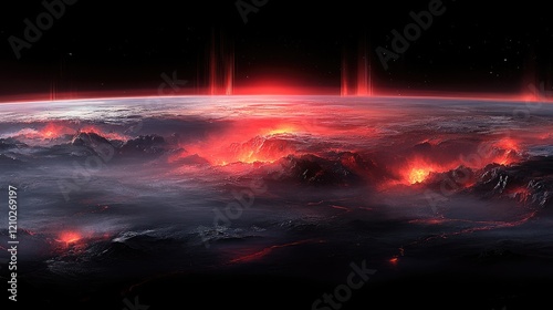 A glowing alien moon rising over a vast, barren landscape, casting long shadows on the ground below.