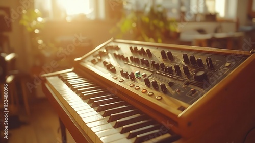 A glowing synthesizer in a sunny workshop, capturing the artist s playful exploration of new melodies